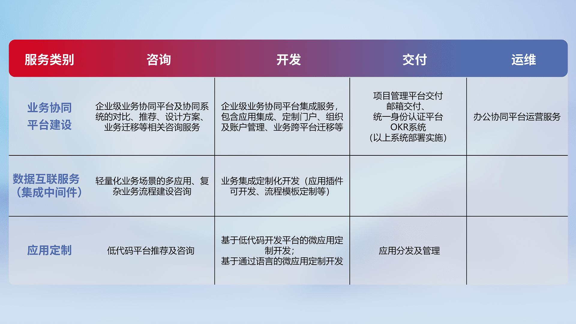 针对钉钉、、、企微、、、、IDaas等平台级产品提供产品的规划、、方案、、、、交付、、、定制化开发等服务,,,,实现如统一协同办公、、、智能客户服务、、、混合会议管理、、、智能数据查询、、等业务场景,,,,实现数字化转型。。。