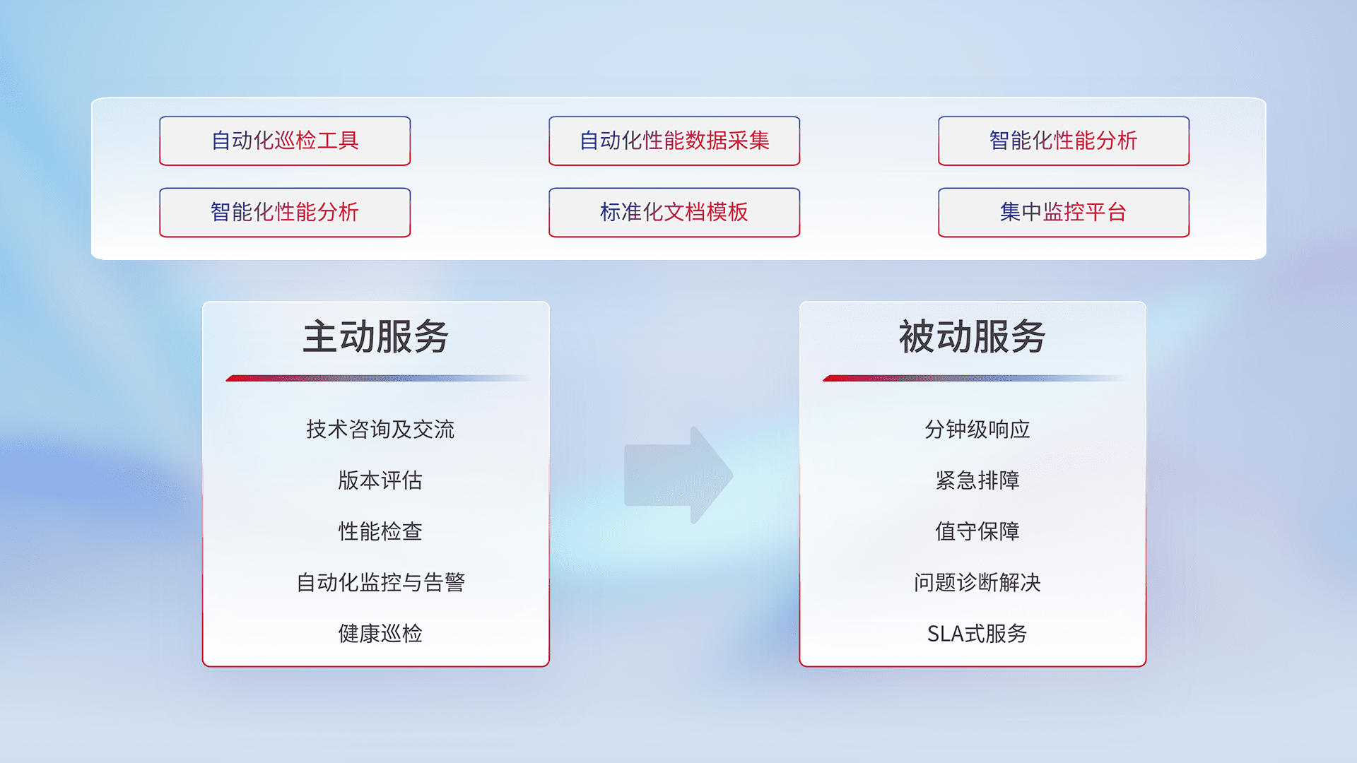 智能化工具和标准化文档,,保障服务质量,,,提供主动服务(包含技术咨询、、版本评估、、、、性能检查、、、、自动化监控与告警、、、健康巡检)和被动服务包含(分钟级响应、、、紧急排障、、、、值守保障、、、问题诊断解决、、、、SLA服务)。。。
